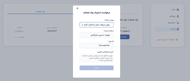 3- با زدن دکمه استرداد، شما میتوانید روش دریافت حضوری را انتخاب کرده و یا ارسال با پست را انتخاب کنید و آدرس مورد نظر خود جهت دریافت چک را وارد نمایید.